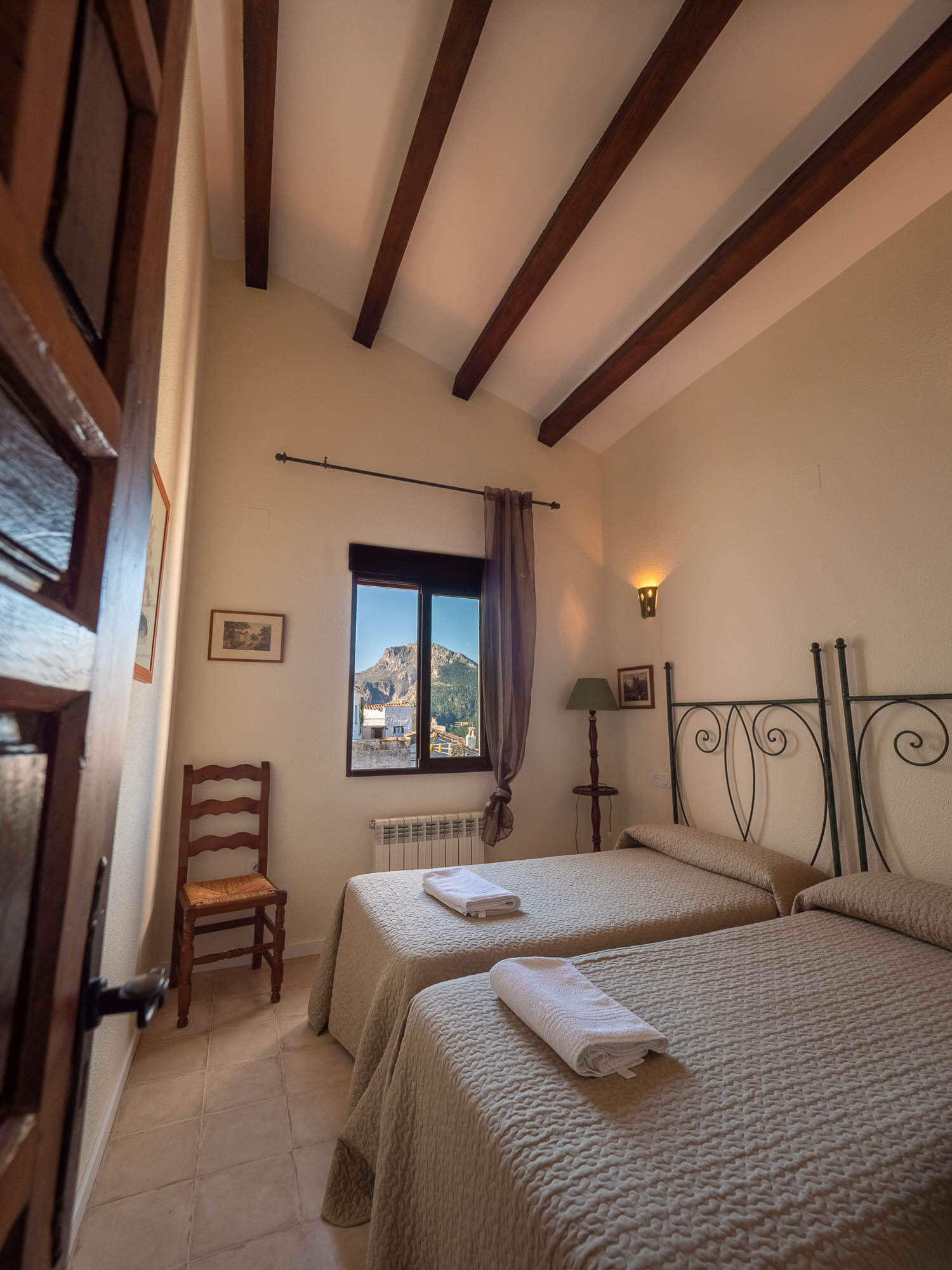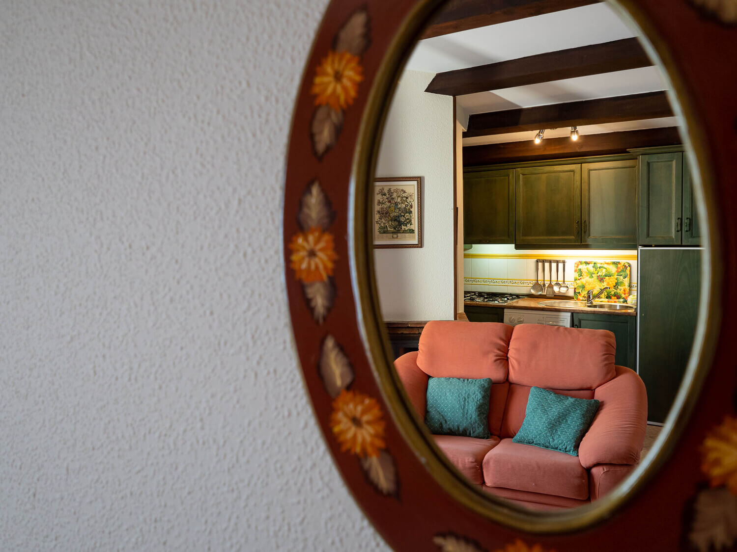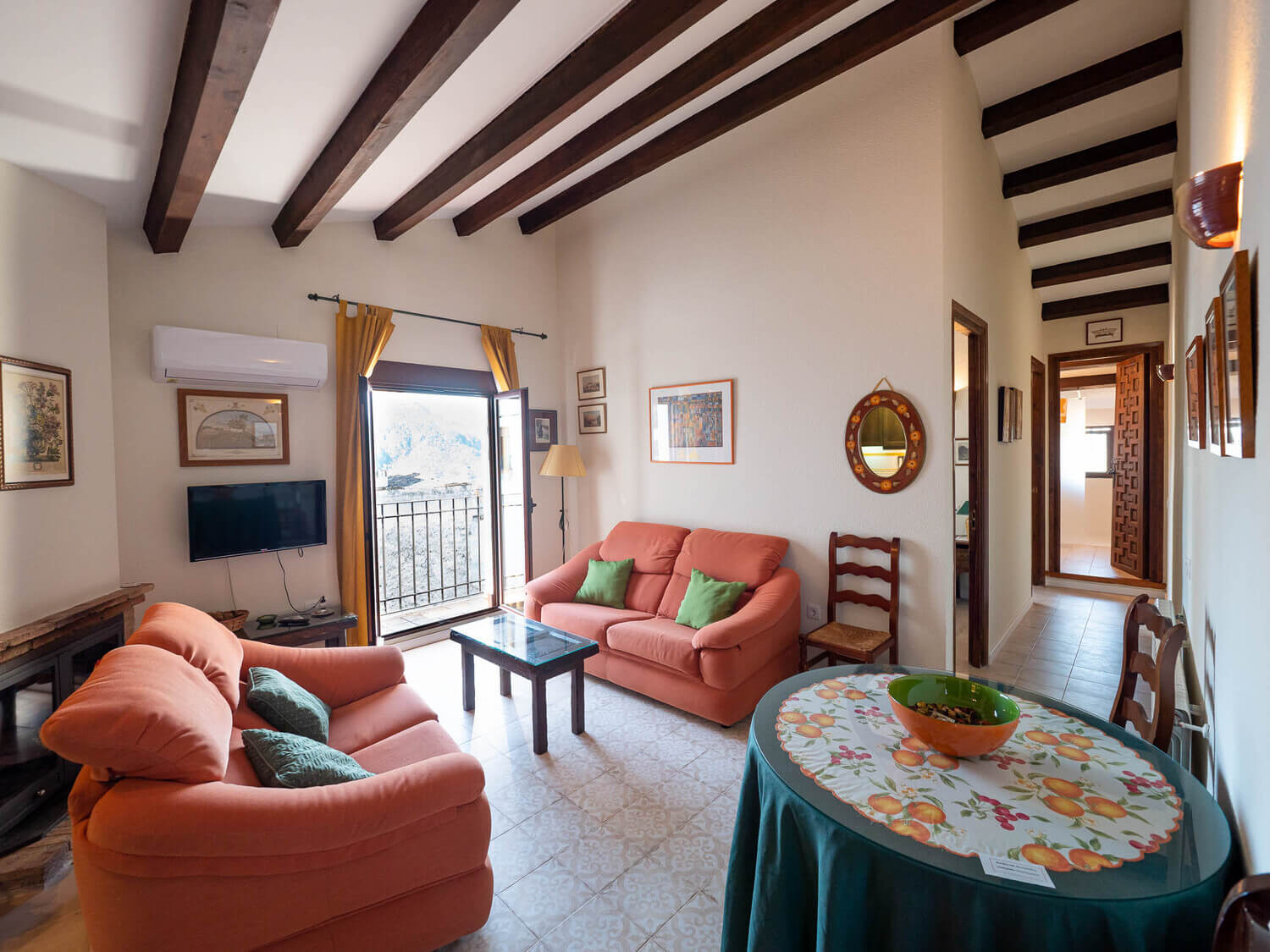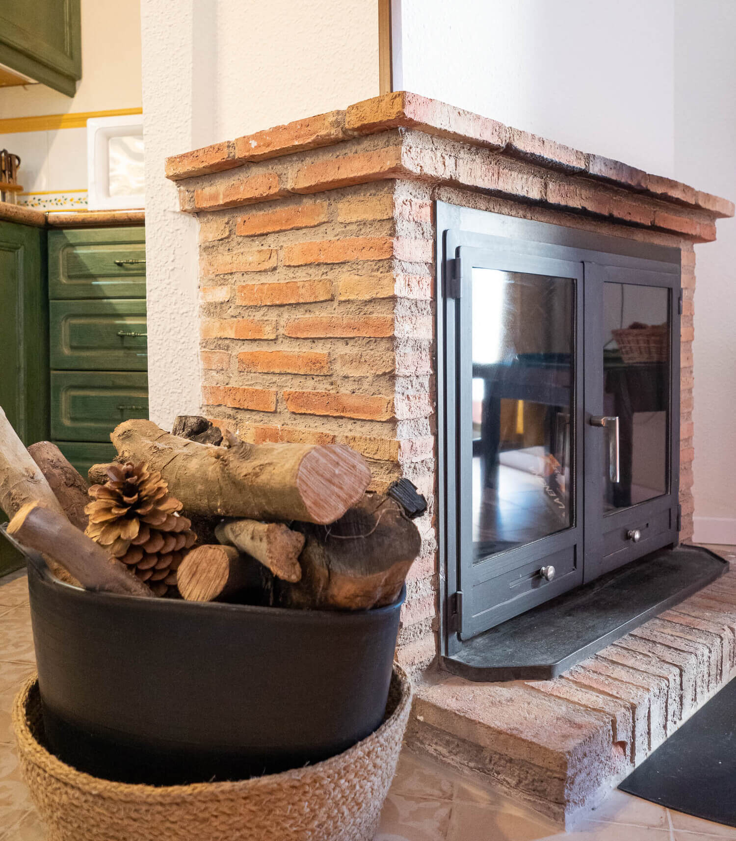 Acogedor apartamento de 65 m2 con dos dormitorios, cocina abierta al salón con chimenea y baño con ducha.